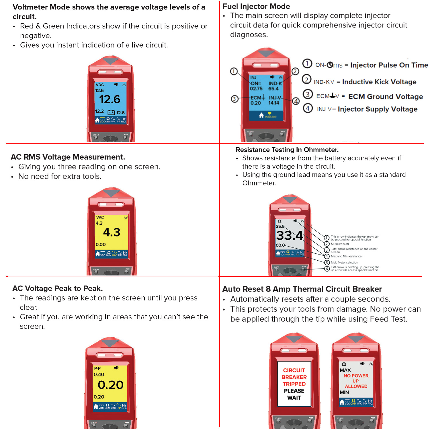 - The Maestro advanced testing: measures DC and AC TRMS including peak-to-peak/min/max, plus resistance, frequency and duty cycle; can also apply battery power or ground at the probe tip for functional checks.